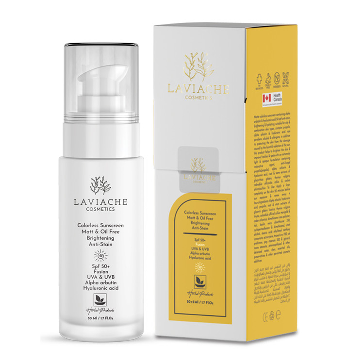 ضد آفتاب بیرنگ +50 SPF فراوری بر پایه آب لاویاچه بی رنگ، مات، ضد لک، روشن کننده و آبرسان حاوی آلفا آربیوتین و هیالورونیک اسید، مناسب پوست چرب و مختلط فاقد روغن، حاوی پروپولیس، آلفا آربیوتین و هیالورونیک اسید فاقد پارابن، الکل و عوامل حساسيت زا.این محصول در کنار محافظت از پوست از آسيب های ناشی از تشعشعات مضر آفتاب کمک به روشن تر شدن پوست و بهبود کک و مک و لک می شود.